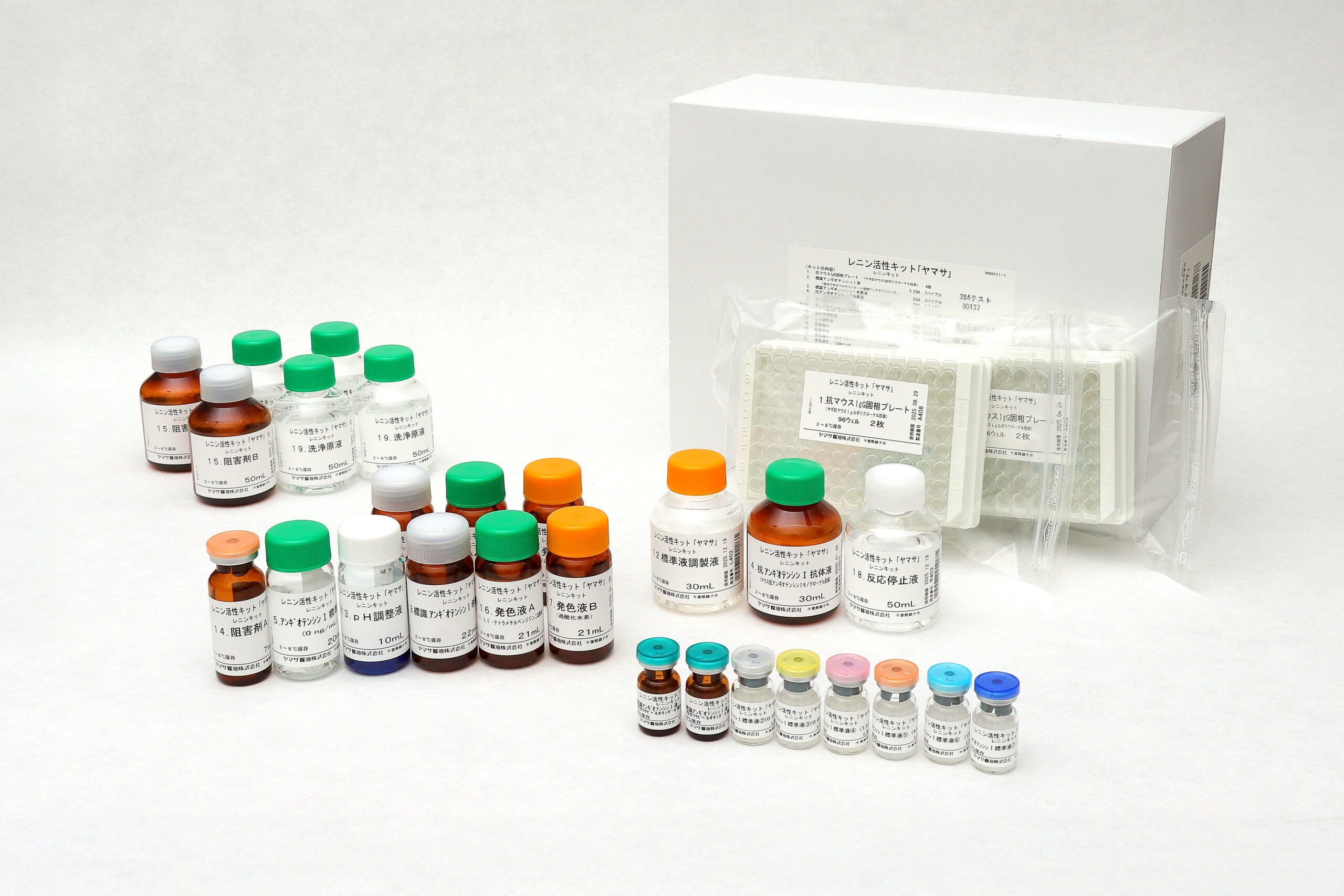 本製品は、検体中のレニンによってアンギオテンシノーゲンを反応させ、そこで産生されたアンギオテンシンⅠを酵素免疫測定法(EIA)で測定することで、レニン活性を定量するキットです。